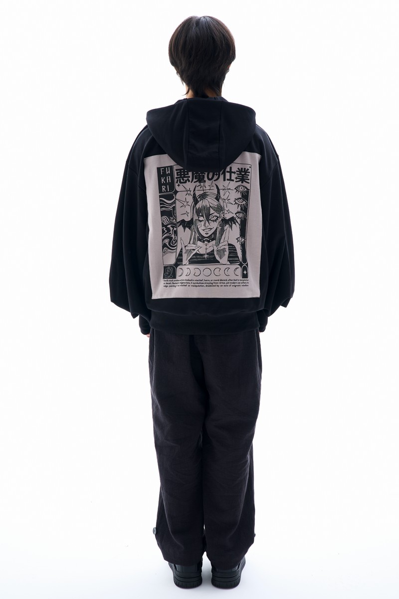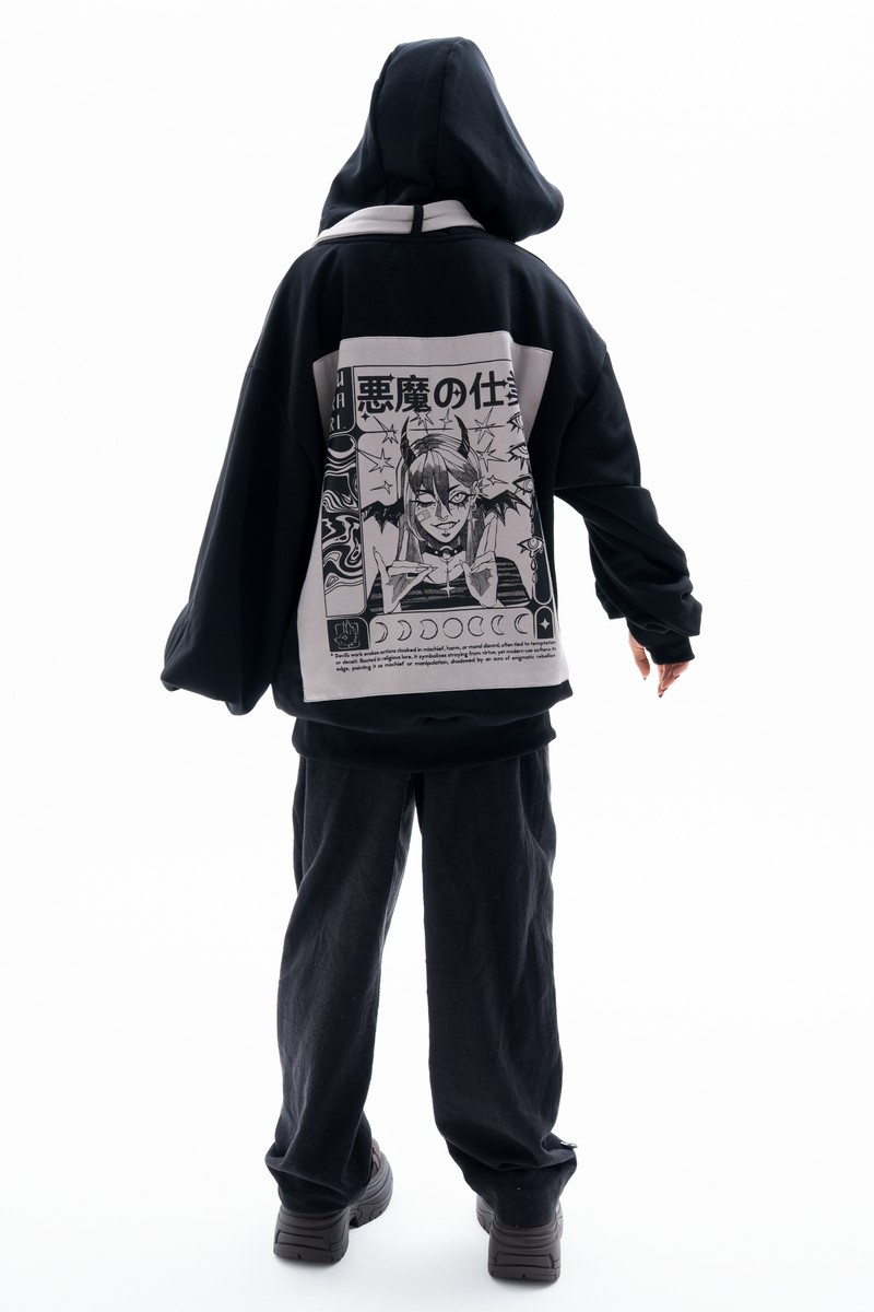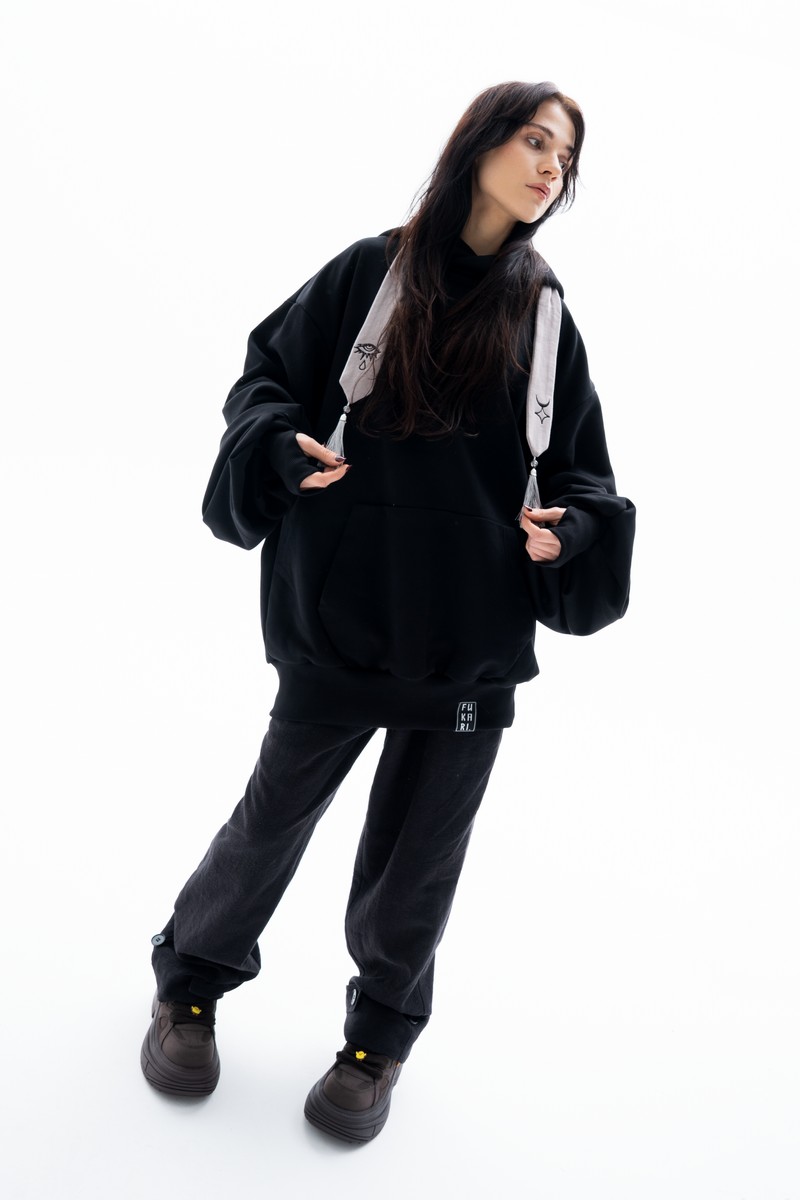 A hoodie for every mischief creature! The generous hood comes with a contrasting light-gray strap that complements the hoodie’s back print. The roomy bishop sleeves (with the thumb-holes to keep your paws warm) add a unique, voluminous silhouette, making it stand out from classic hoodie designs.