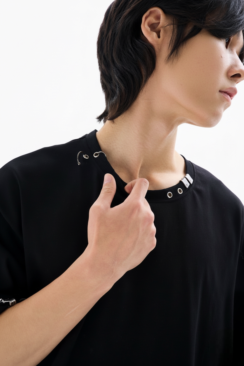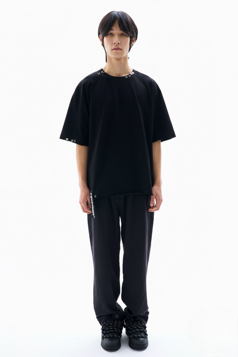 Metal piercings mark the collar and right sleeve — small fractures in the calm. At the hem, a black grosgrain strap hangs freely, carrying the word Niespokój — a Polish word formed from “nie” (no) and “spokój” (peace). Not a direct translation, but a feeling: the moment between calm and tension, between control and the urge to move. Cut in a relaxed, boxy unisex fit with dropped shoulders, the shirt drapes freely while keeping its shape.