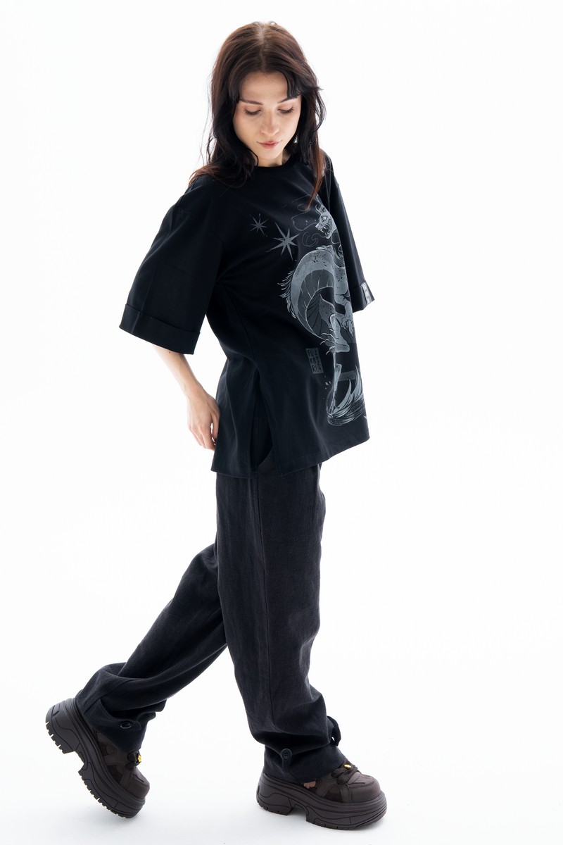 This loose-fit t-shirt is designed for those who love a relaxed silhouette with a bit of extra flair. The slightly longer sleeves give it a modern edge, making it a perfect blend of comfort and style. I strive to create clothes that aren't just about looking good—they're about feeling great too.